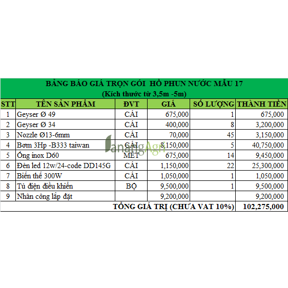 Còn tuy vào kích thước hồ phun và kiểu phun mà giá có thể thay đổi
